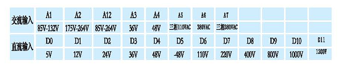 五、輸入電壓:“A”表示交流,“D”表示直流。右下角不同數(shù)字表示不同的電壓